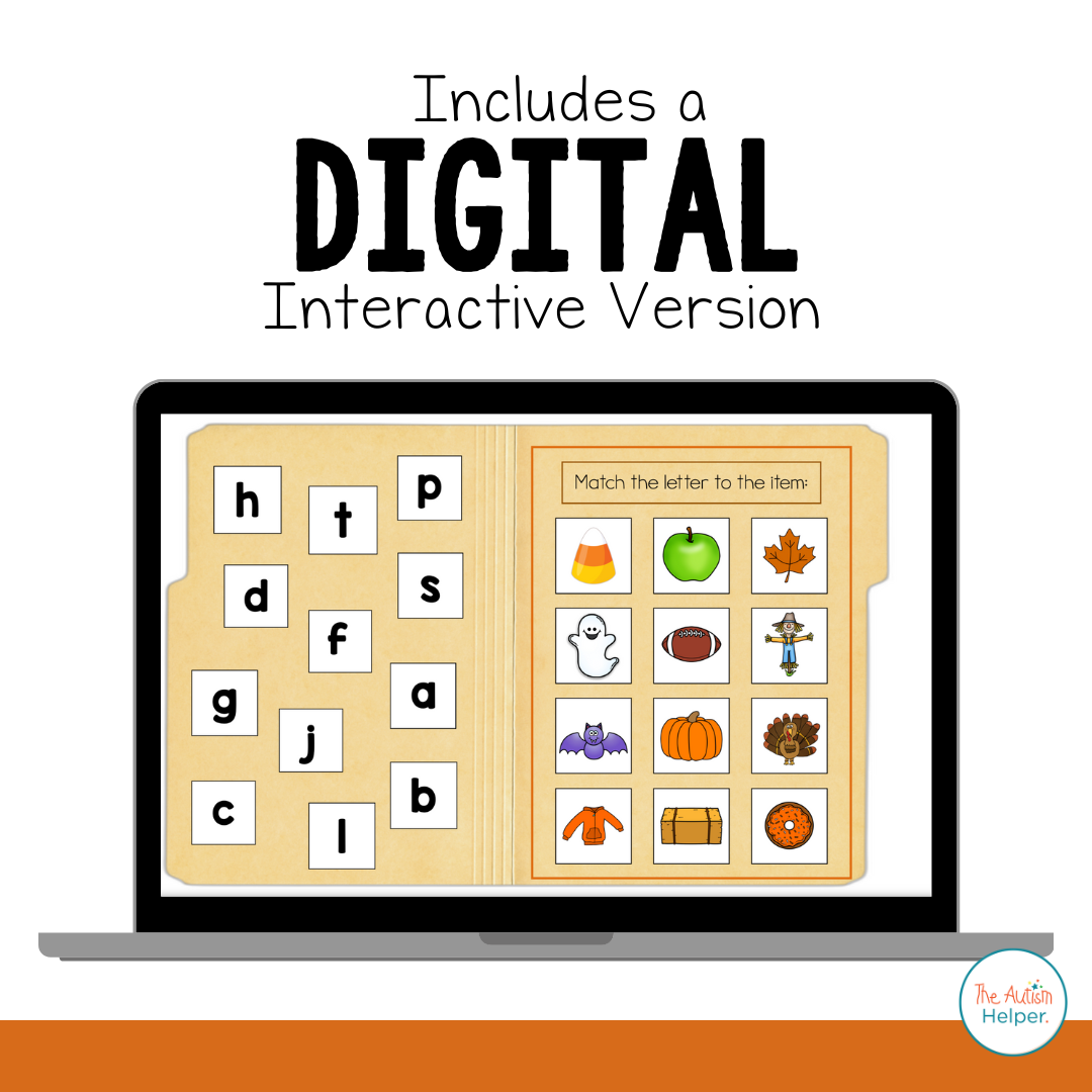 Supplement your instruction during the fall season with our set of 30 hands-on AND digital fall-themed file folder activities, each designed to enhance fundamental academic skills. These activities offer versatile learning opportunities targeting counting, addition, subtraction, sequencing, early phonics, categories, associations, patterns, and more! Perfect for independent work, guided practice, partner activities, or thematic units, these resources cater to diverse learning styles and environments. Whether in the classroom or at home, these activities provide a fun and educational way to support skill development for individuals with autism and special needs.