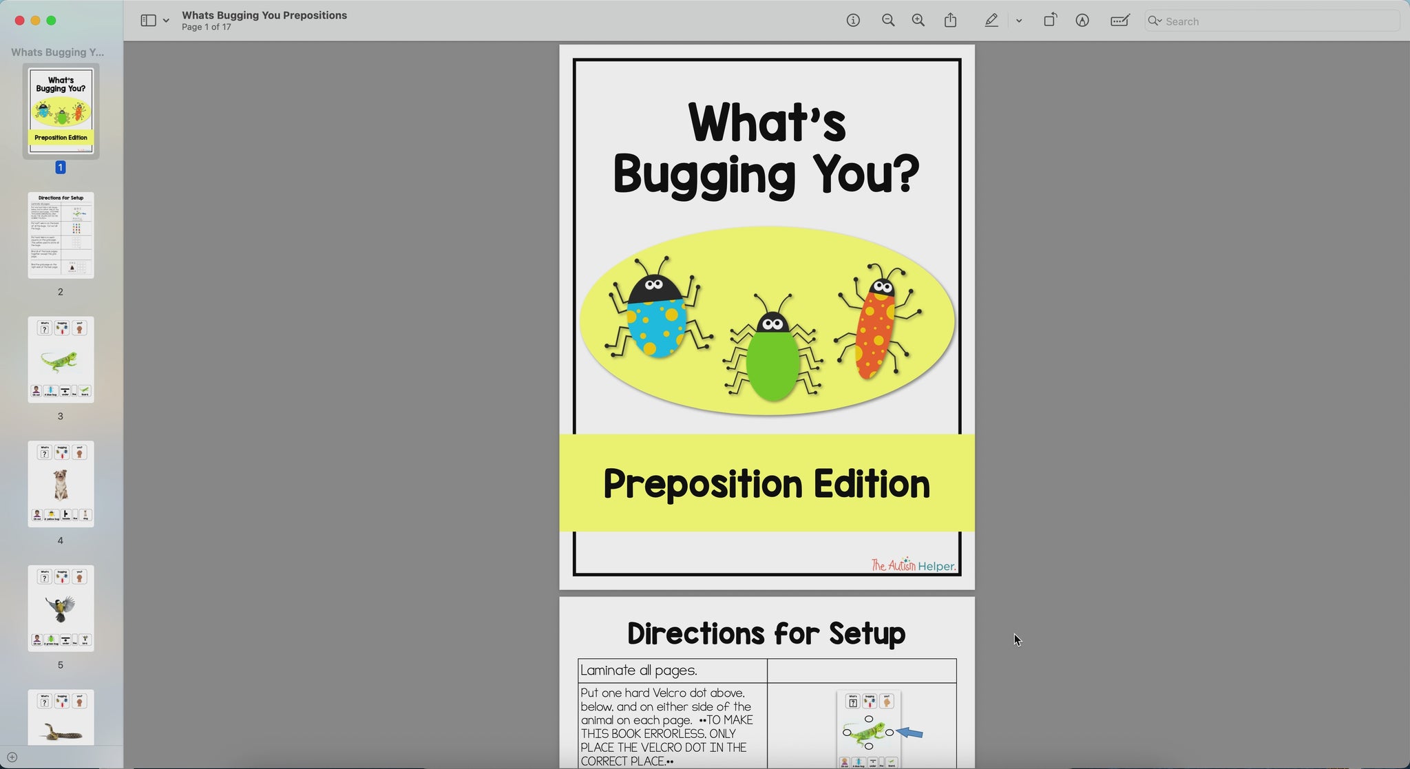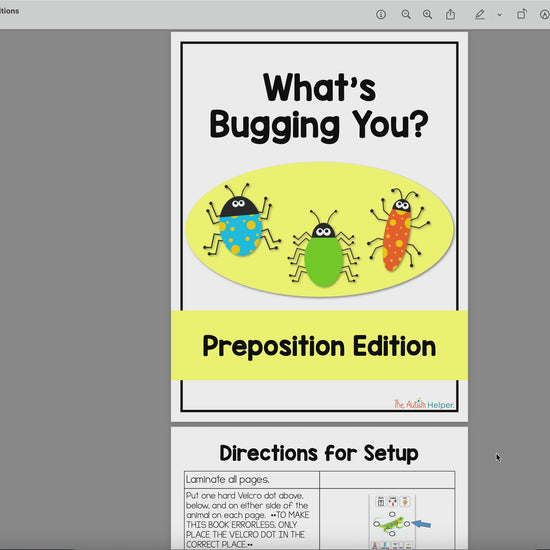 Engage your students in a fun and interactive reading activity with this adapted book. With a structured and repetitive routine on each of the 12 pages, this book focuses on vocabulary modeling, comprehending prepositions, and repetitive reading, making it an ideal resource for language development. Students place a velcro bug on each page which creates an engaging learning environment. This book uses a mix of real photos and realistic clipart making it age-appropriate for many learners. Setup instructions, bug pieces, and a storage page are included. Instructions to make this book errorless are on the instructions page!