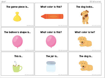 These task cards are aligned to the ABLLS-R task C24 and G13. All cards are labeled with the corresponding task number and score for easy organization and use. Perfect for direct instruction, independent work, guided practice, or small group instruction/centers!