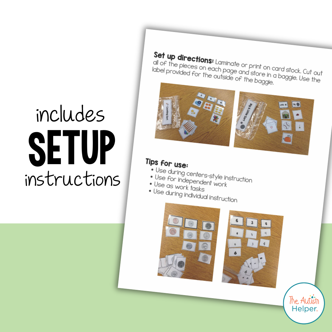 Transform math into an enjoyable and interactive experience with these engaging hands-on math sorts, specifically designed for basic skills! This comprehensive packet encompasses four types of sorts: counting, big/little, coins, and number identification. Students participate in sorting activities, counting pieces up to a specific number, differentiating between big and small items, categorizing various images of the same coin, and sorting by number. Ideal for both teacher-directed instructional time and independent work, these activities provide an interactive approach that goes beyond basic velcro matching. Tailored for all students, particularly those with autism, this resource facilitates the hands-on learning of fundamental math skills.