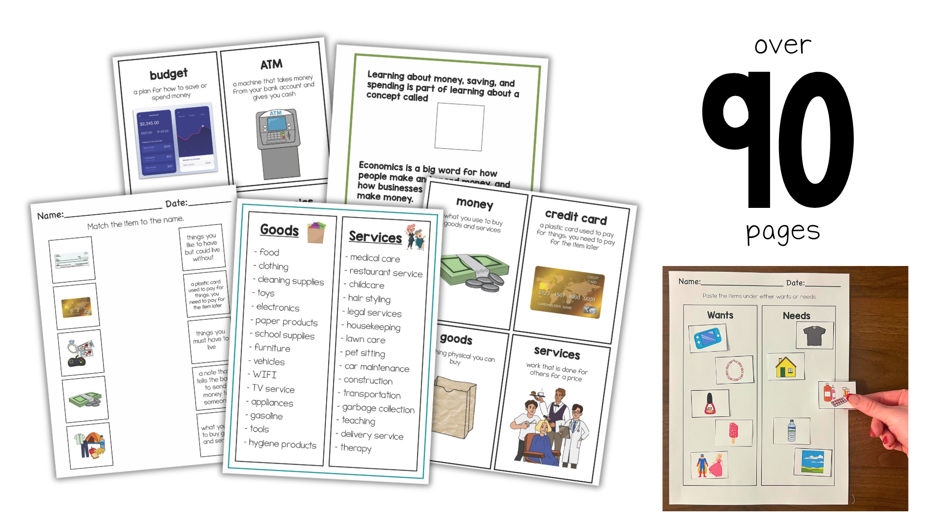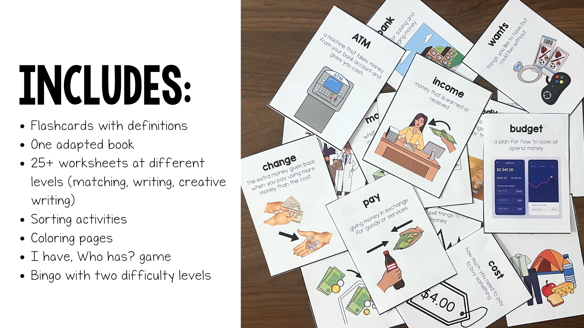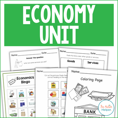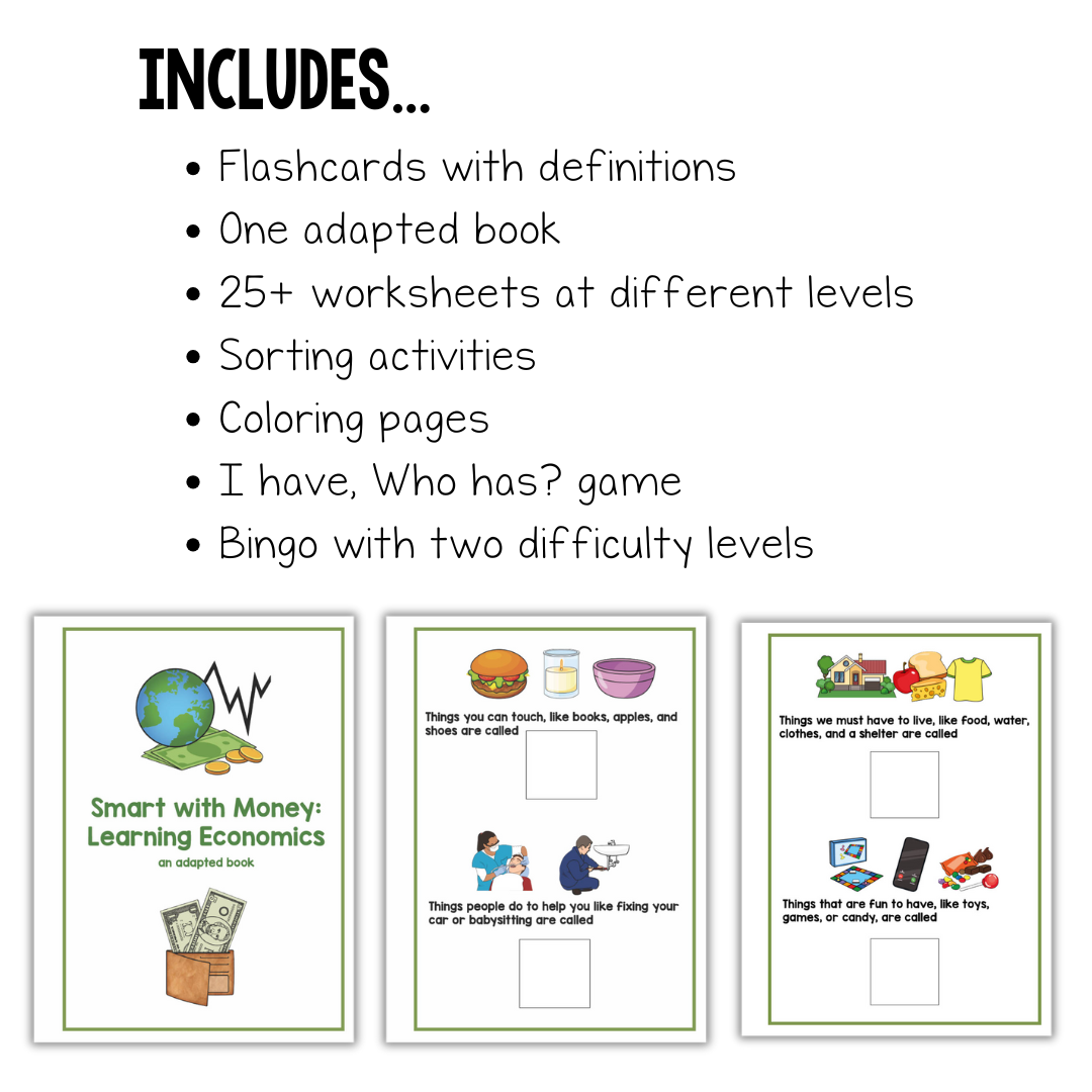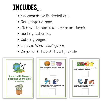 Explore the basics of economics with this comprehensive unit tailored for special education. Packed with a variety of activities at different skill levels, this important social studies theme facilitates academic learning about life skills. Designed for differentiation across diverse learning styles, the unit includes flashcards with definitions, one adapted book, 25+ worksheets at different levels (matching, writing, creative writing), sorting activities, coloring pages, 'I have, Who has?' game, and Bingo with two difficulty levels. This resource is ideal for a diverse classroom and includes activities for both individual, small group, and whole class lessons.