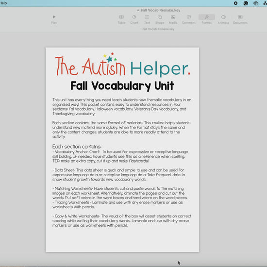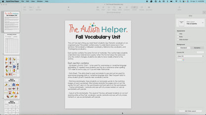 Enhance your fall thematic and seasonal vocabulary instruction with this set of 4 comprehensive units designed for special education. Expose learners to vocabulary across these topics: general fall, Halloween, Thanksgiving, and Veteran's Day. Each section follows a consistent and effective format, promoting accelerated learning for students with special needs. Engage learners with vocabulary pages, individualized visual data sheets, spelling worksheets, writing exercises, and tracing worksheets—all structured and visual activities adaptable for various learning styles. Make seasonal vocabulary instruction impactful and inclusive with this dynamic resource, featuring over 60 activities!