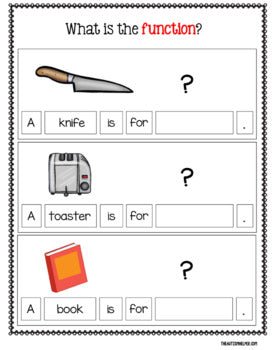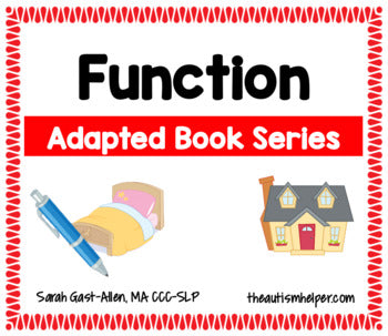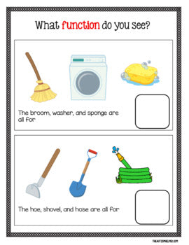 These books offer a visually engaging and interactive platform, ideal for students with limited language abilities to hone more advanced language skills. In "I Spy Functions" students select an item that goes in the named function type. "What is the Function?" challenges students to select the correct function (with a visual) for a group of items, and "What Function Do You See?" challenges students to select the correct function name (text only) for a single item using more advanced function options. Setup instructions and a storage board for pictures are included for your convenience.
