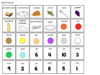Immerse your students in a Thanksgiving-themed adapted book designed to enhance their ability to recognize numbers, colors, and Thanksgiving vocabulary. This book features 5 pages, each with 2 themed item groups, totaling 10 unique Thanksgiving-related groups. Students participate by matching pictures to answer questions about quantity, color, and item names. Setup instructions and a storage page are included.