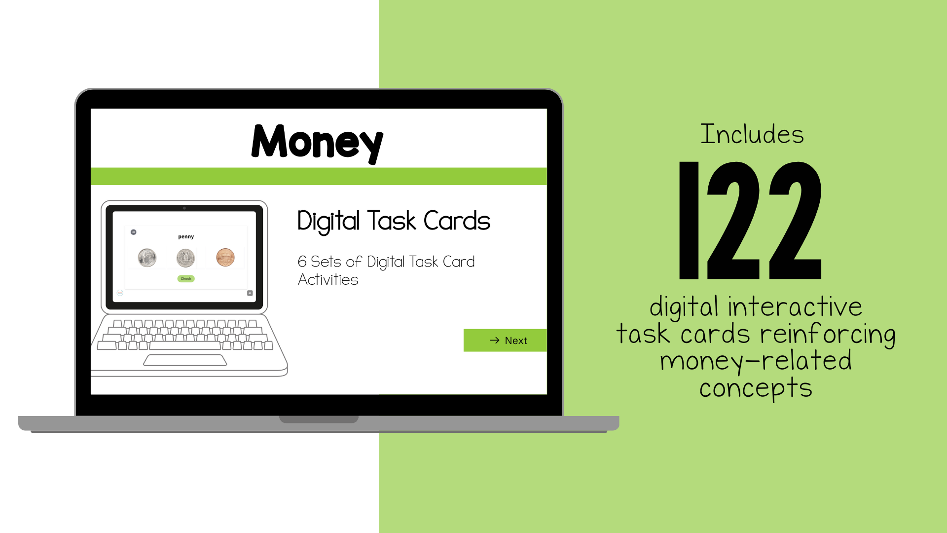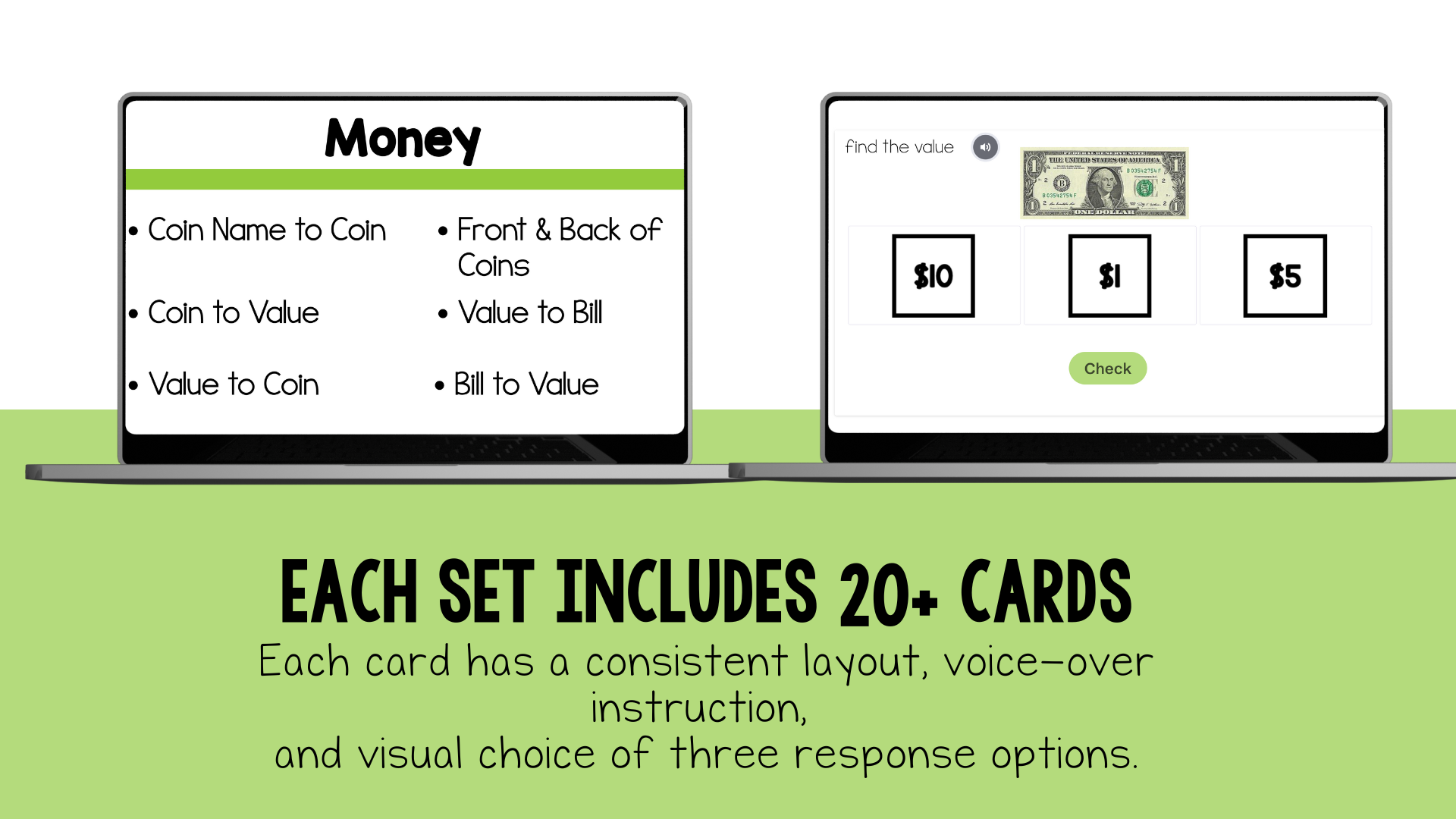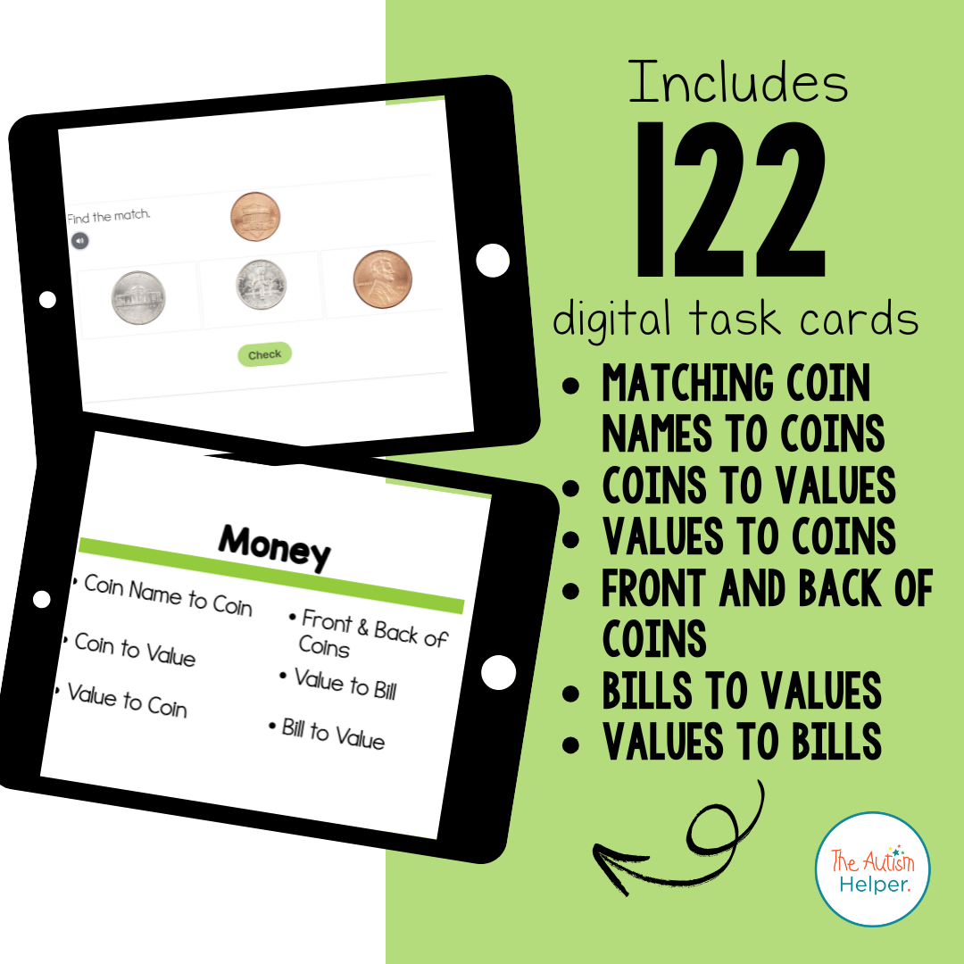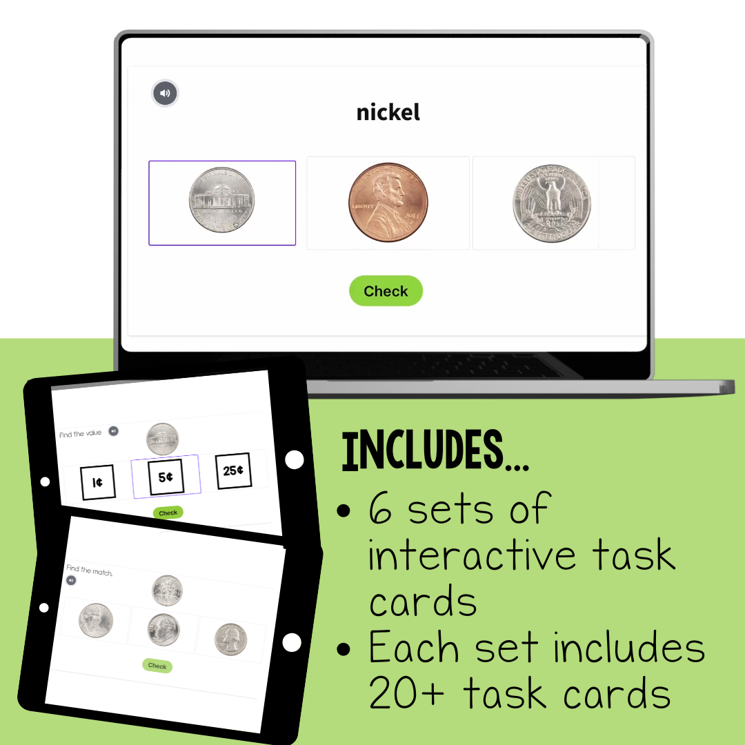 Improve your learners' money skills with this set of six unique decks totaling over 120 digital task cards! This resource covers crucial aspects such as matching coin names to coins, coins to values, values to coins, front and back of coins, bills to values, and values to bills. Featuring 20+ cards in each deck, these decks offer diverse exercises with voice-overs for educators and parents to reinforce money-related concepts effectively.