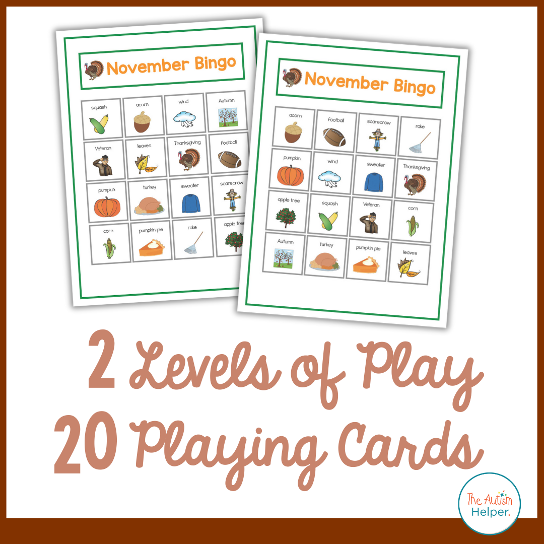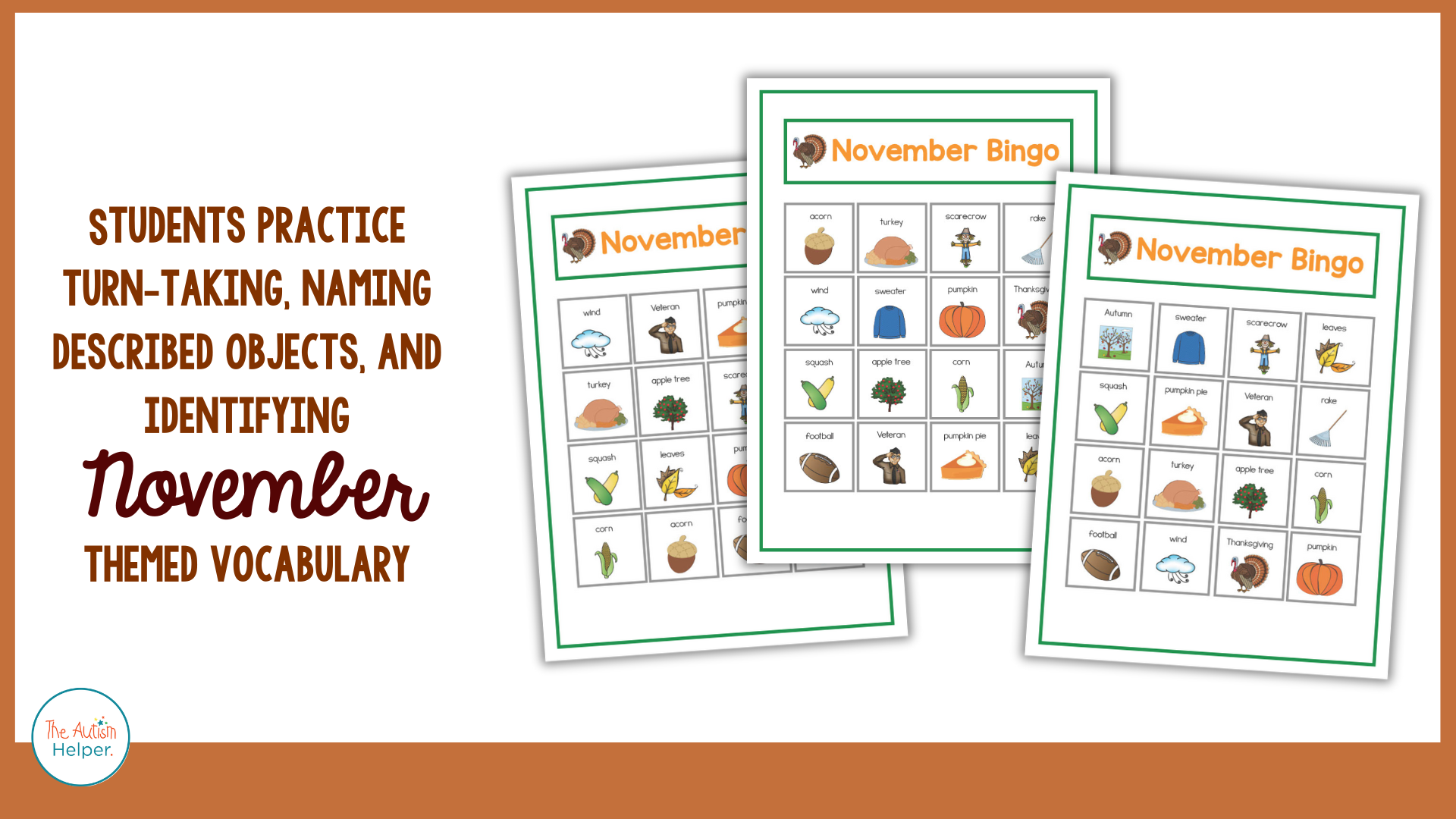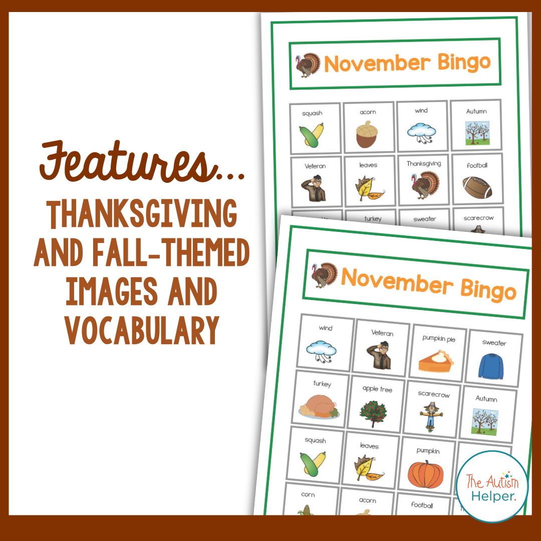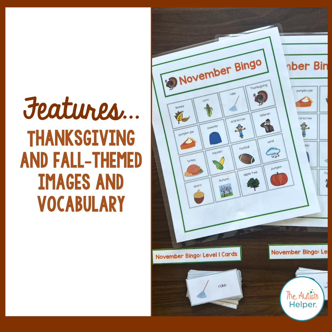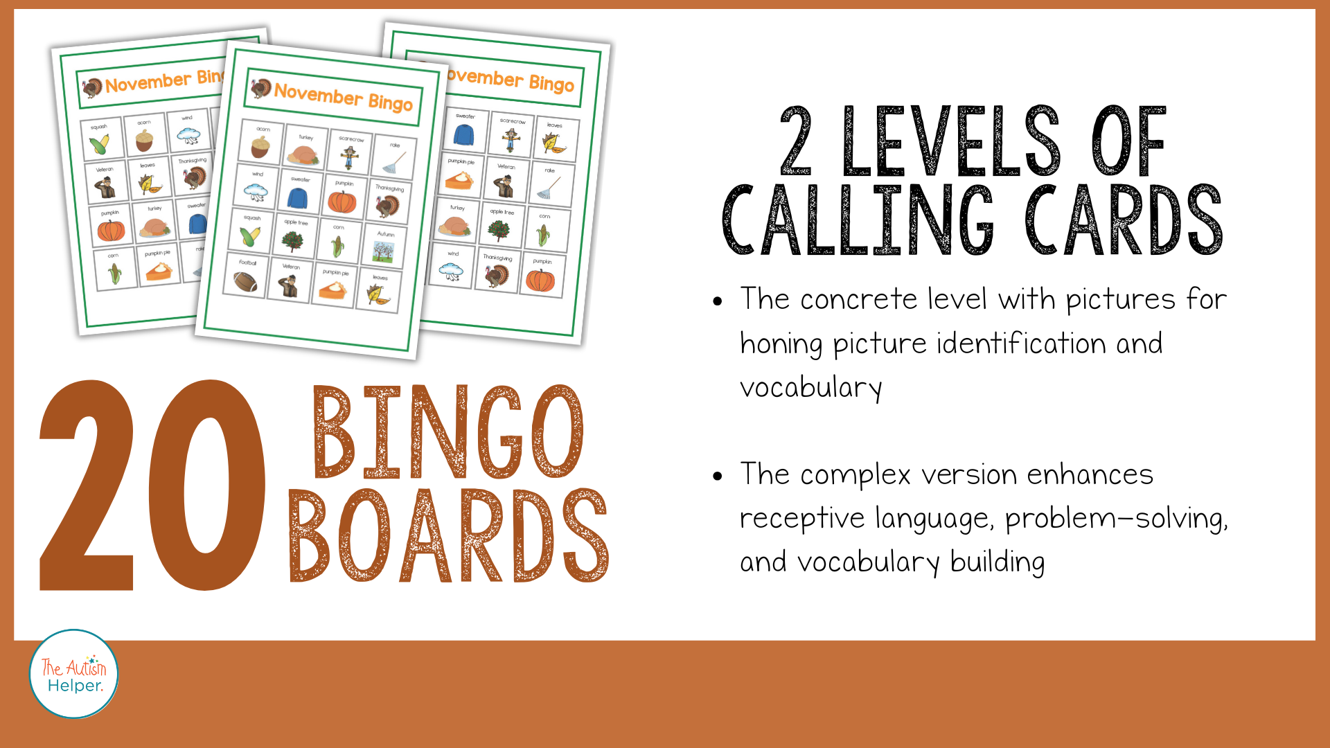 Transform your November activities with this vocabulary-rich Bingo resource. Featuring 20 boards and calling cards for two skill levels, this thematic resource offers a concrete level with pictures for honing picture identification and vocabulary, while the complex version enhances receptive language, problem-solving, and vocabulary building through written descriptions. Bingo is an effective tool for nurturing turn-taking and leadership skills. Ideal for independent group time, empower a student to take charge of showing or reading the cards. Elevate your speech therapy sessions effortlessly with this ready-to-use resource—just laminate or print on cardstock, and it's good to go!