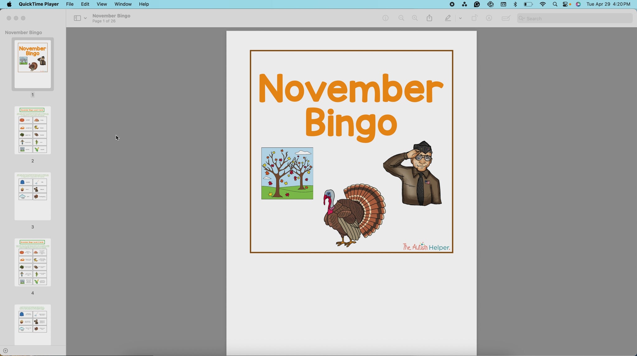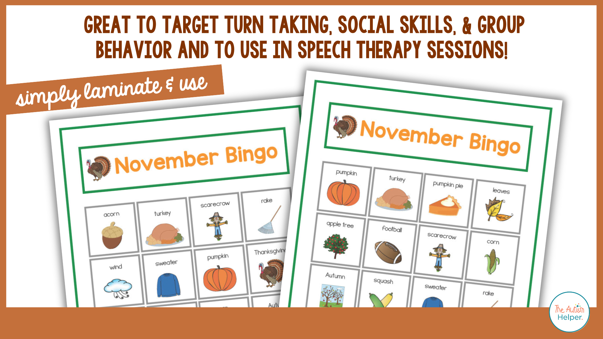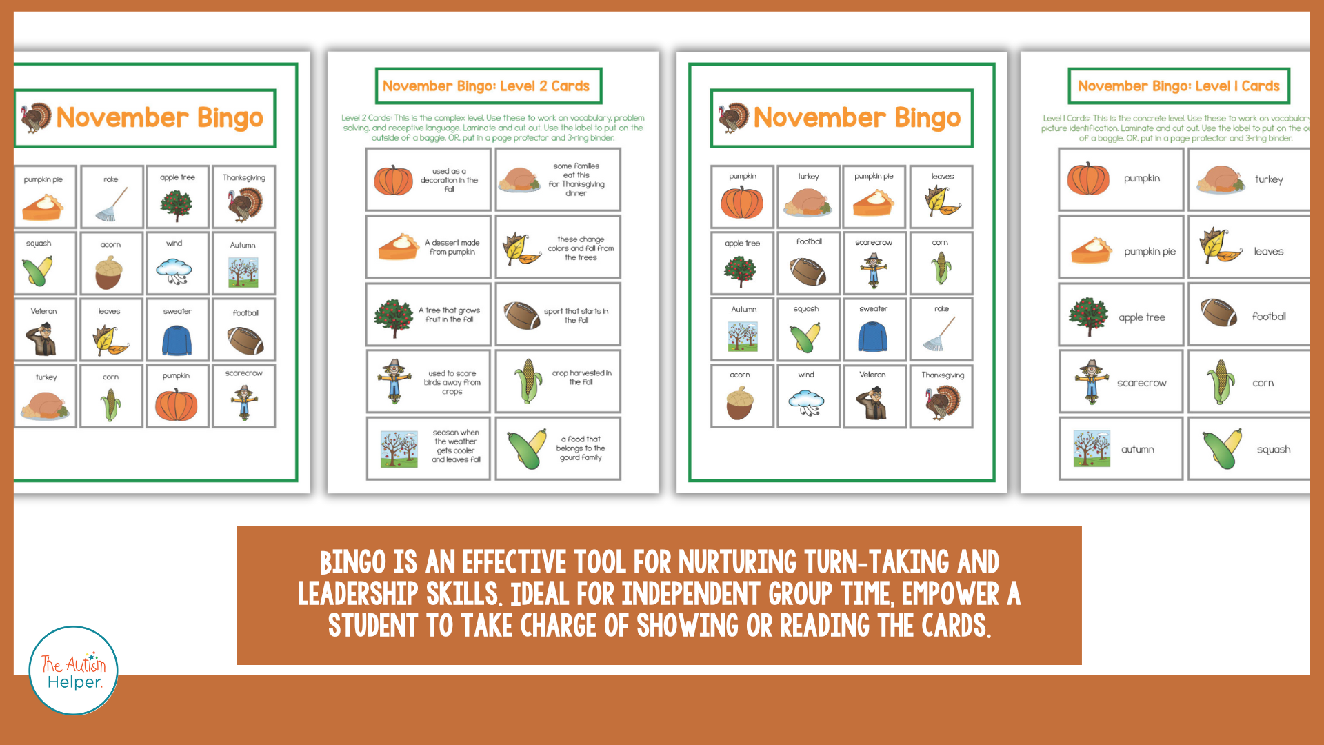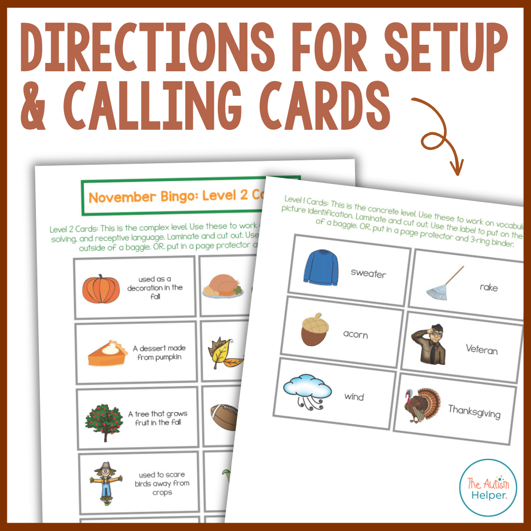 Transform your November activities with this vocabulary-rich Bingo resource. Featuring 20 boards and calling cards for two skill levels, this thematic resource offers a concrete level with pictures for honing picture identification and vocabulary, while the complex version enhances receptive language, problem-solving, and vocabulary building through written descriptions. Bingo is an effective tool for nurturing turn-taking and leadership skills. Ideal for independent group time, empower a student to take charge of showing or reading the cards. Elevate your speech therapy sessions effortlessly with this ready-to-use resource—just laminate or print on cardstock, and it's good to go!