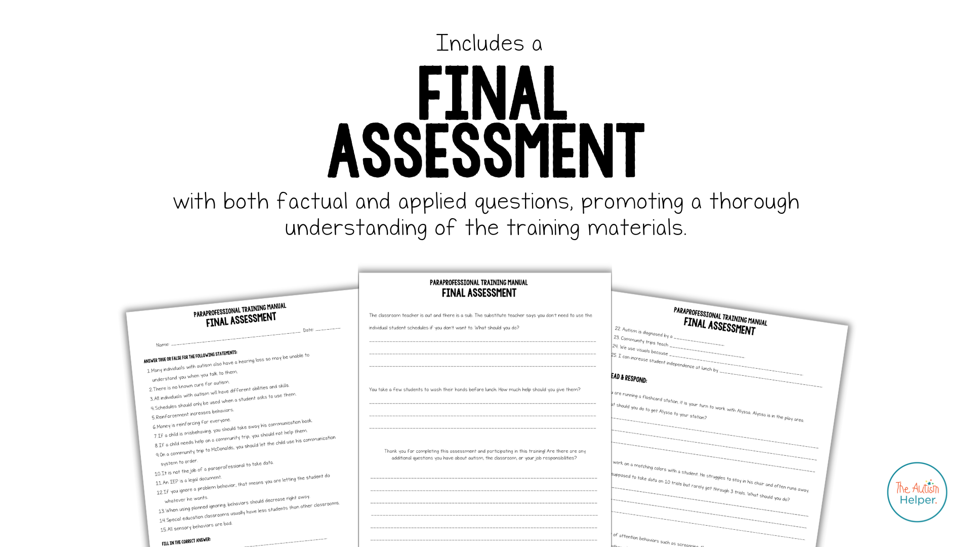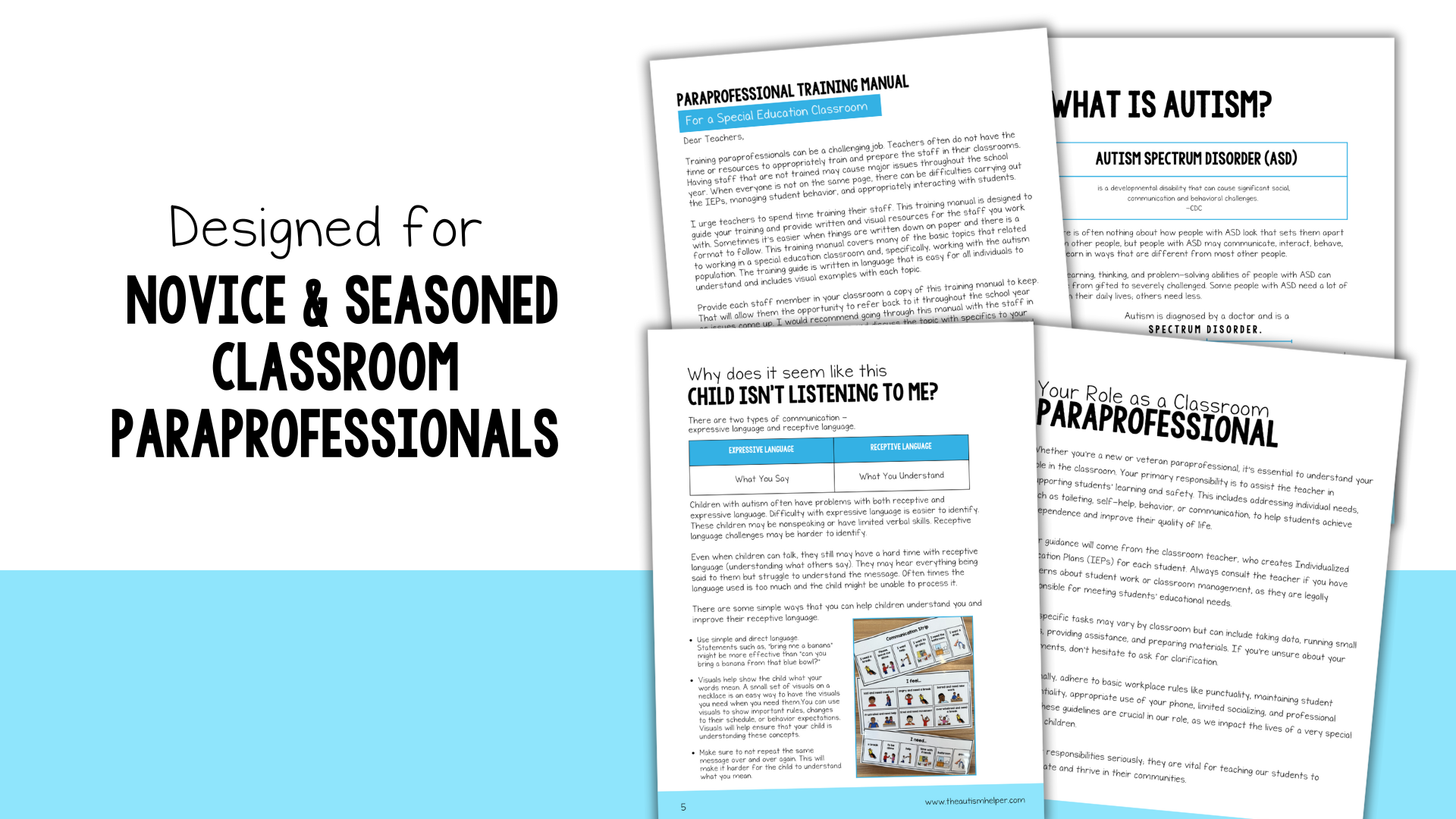 Streamline the process of training classroom staff with this comprehensive manual tailored for special education teachers and parents of autistic students. Designed for both novice and seasoned classroom paraprofessionals, this resource offers an in-depth training package covering topics ranging from the diagnostic criteria of autism to fostering communication development and managing student aggression. The manual is presented in an accessible format with photo examples for clarity. Each section includes a follow-up review to reinforce crucial points, ensuring mastery of the topics. The package also features a final assessment with both factual and applied questions, promoting a thorough understanding of the training manual.