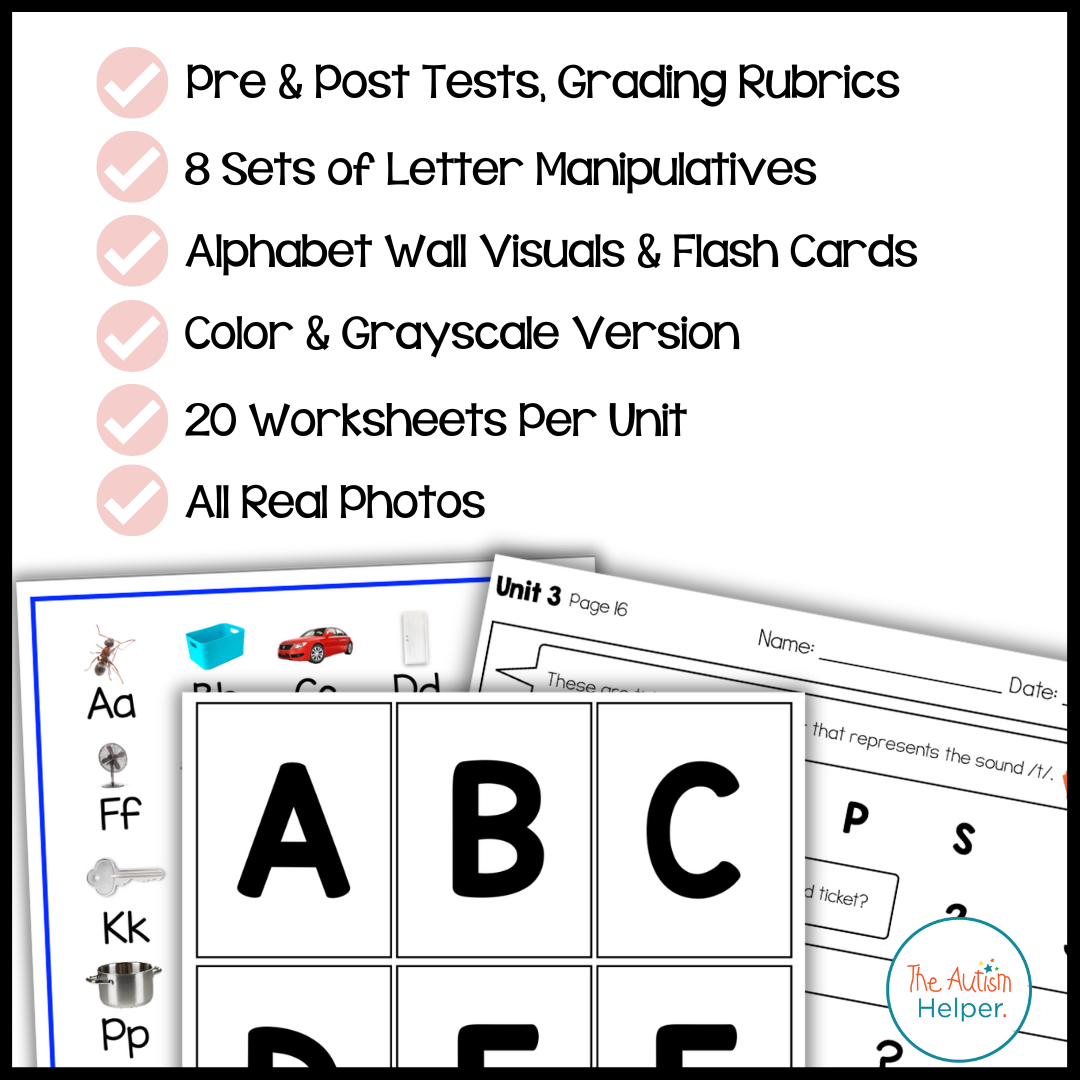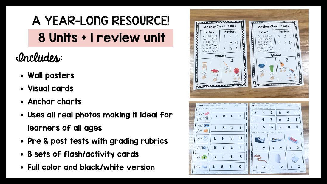 Phonics Level 1 focuses on explicit instruction, modeling, and teaching foundational literacy skills. This evidence-based resource is aligned to the Science of Reading! This resource is visually based and uses all real photos making it age-appropriate for learners of any age. Included are both color and greyscale versions.