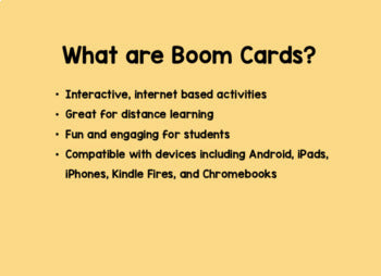 Boom Cards™ play on most modern browsers (Chrome, Safari, Firefox, and Edge) and devices including Android, iPads, iPhones, Kindle Fires, and Chromebooks. They can also be used via Google Classroom.