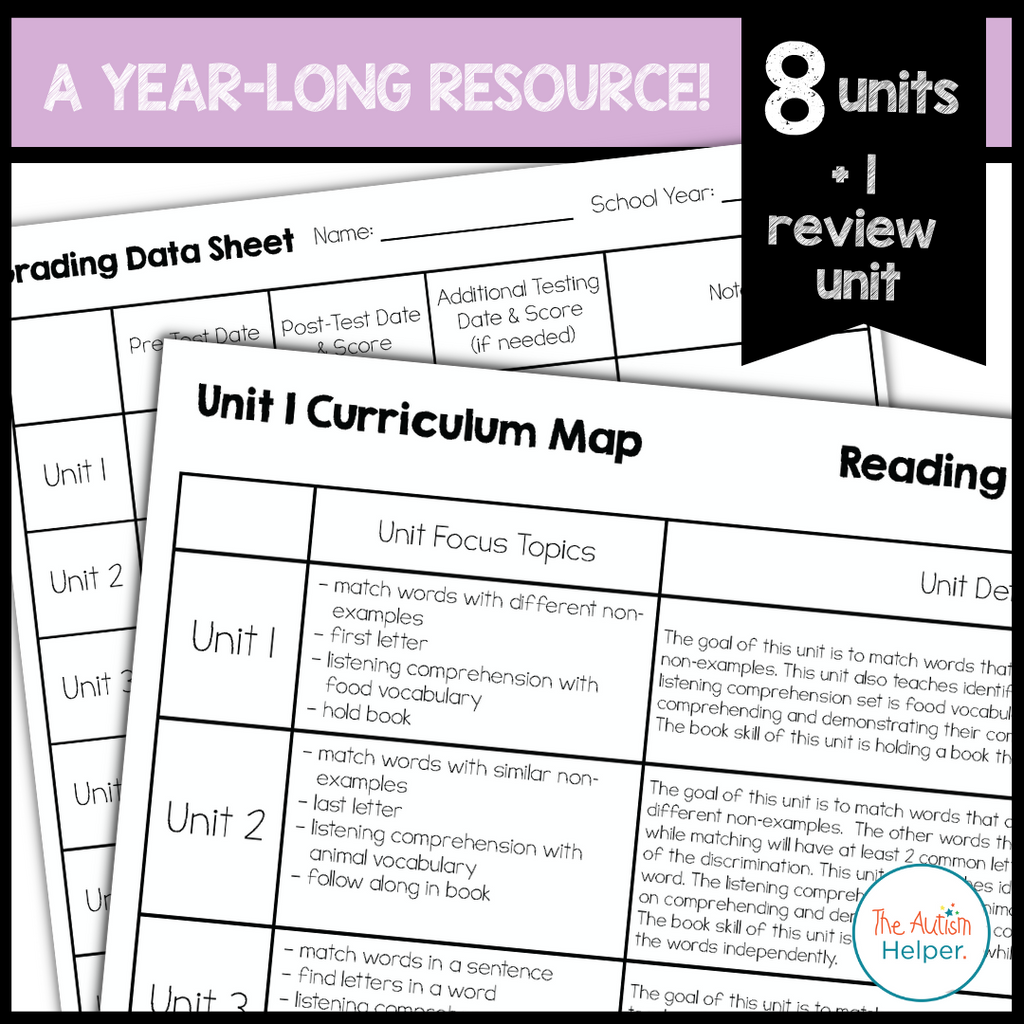 This year-long reading comprehension curriculum focuses on teaching reading comprehension skills and concepts. This resource is designed for special education students and autistic learners as it is visual-based and features a step-by-step progression of skills. It includes a non-writer version (requires only pre-writing skills) for seamlessly differentiated instruction.