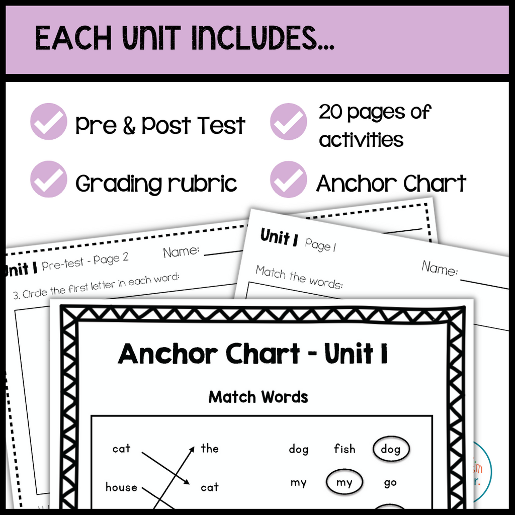 Level 1 of our Reading Comprehension Leveled Daily Curriculum focuses on focuses on teaching basic reading comprehension skills, including: matching words (increasing difficulty, within a sentence); identifying first and last letter of words; find letters within a word; match sentences; identify letter sounds; listening comprehension with the following themes: animals, food, sports, clothing, community, household, school supply, and transportation; and book skills: holding a book, following along, one to one correspondence with words, turning the page, and identifying items/letter sounds in a book.