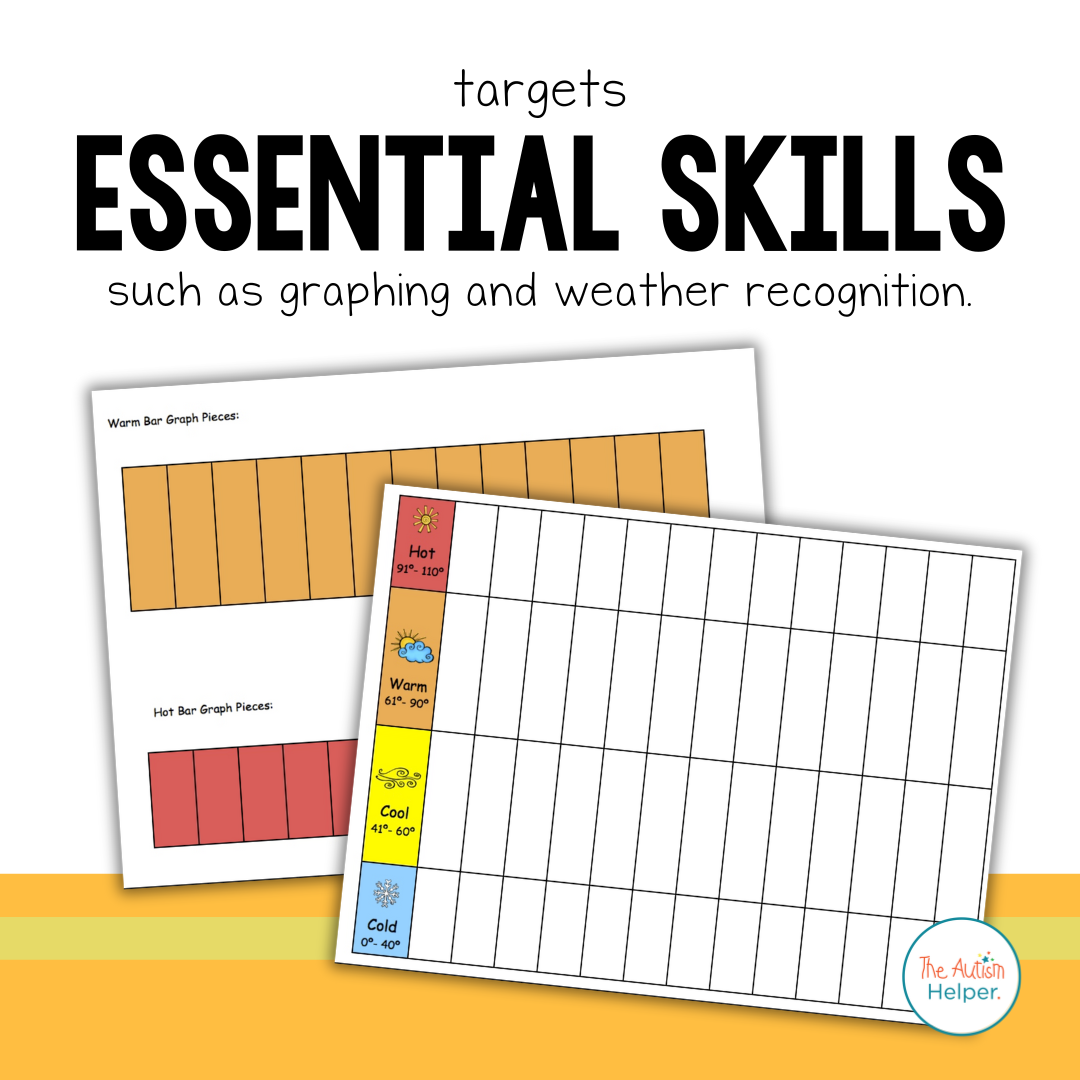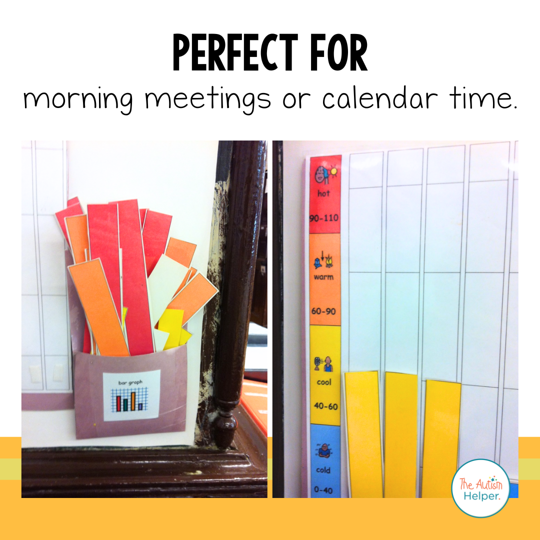 Elevate your classroom with this interactive and visually engaging temperature graph, designed for daily use during morning meetings or calendar time. Ideal for targeting essential skills such as graphing and weather recognition, this resource caters to diverse learners. Enhance your special education curriculum by incorporating common learning standards and fostering higher-level skills. The comprehensive package includes a bar graph, accompanying pieces, labels, visual temperature key, and detailed setup instructions.