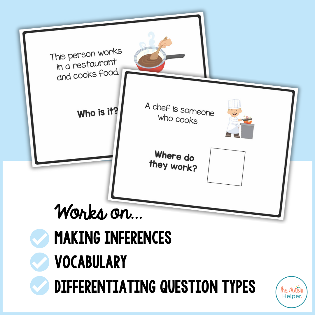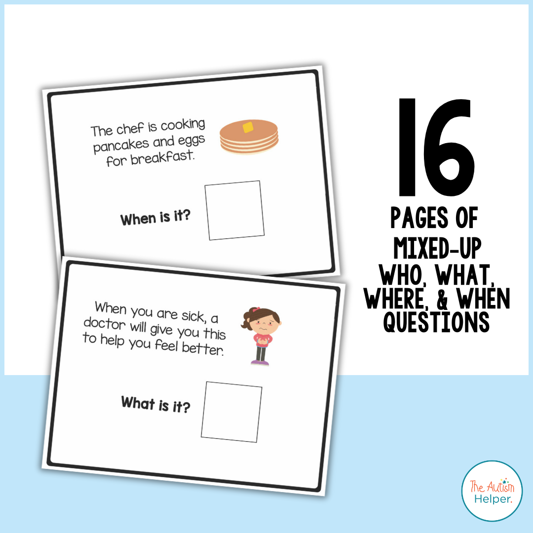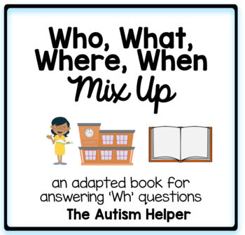 This interactive adapted book teaches students to distinguish between who, what, where, and when questions. It includes 16 pages, each with clues for distinct answers. Students move the correct answer to each page. The resource aims to develop essential inference, vocabulary, and question-answering skills, vital for children with language delays who often struggle with question discrimination and require direct instruction for differentiation. Detailed setup instructions and picture storage are included!